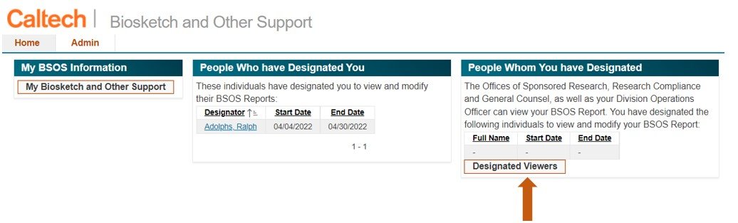 - Select "Designated Viewer." A pop-up window will open. Please designate at least your Grant Manager or another Administrative Personnel who helps you assemble your Biosketch and Other Support documentation. Postdocs and Research Staff should also designate their PI/Advisor. You may designate anyone you wish at Caltech.