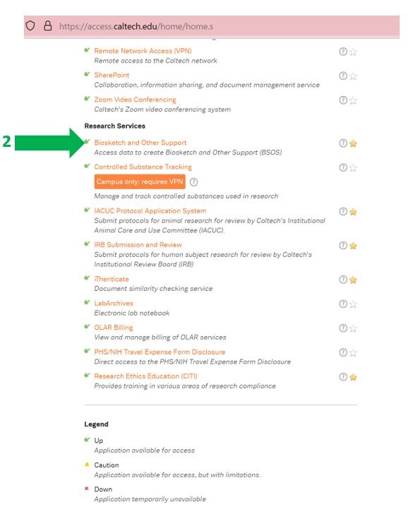 On April 5, 2022, the Offices of Sponsored Research, Research Compliance and General Counsel presented a refresher course on NIH Biosketch and Other Support Requirements and provided training for use of the new Biosketch and Other Support (BSOS) application available on ACCESS.Caltech.edu. Highlights and a link to the presentation and slides are found on this webpage. Shortcuts to the various sections are provided here: