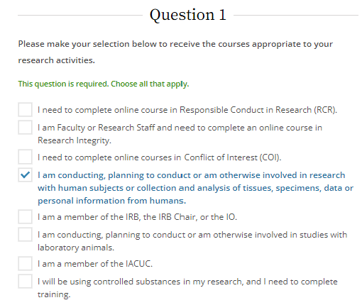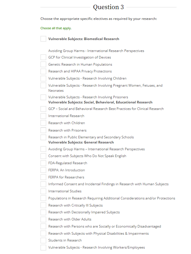 If you have not chosen the necessary courses, you will be instructed by the IRB to complete additional supplemental modules based upon your research.