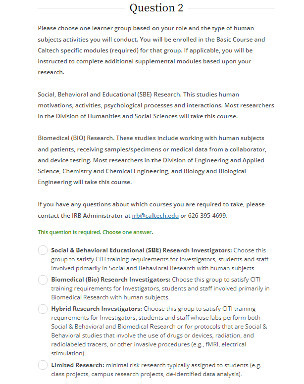 Caltech's training program for human subjects researchers involves on-line training modules found on the Collaborative Institutional Training Initiative (CITI) website. CITI is available by logging into your access.caltech homepage, under the Research Services section, "Research Ethics Education (CITI)".